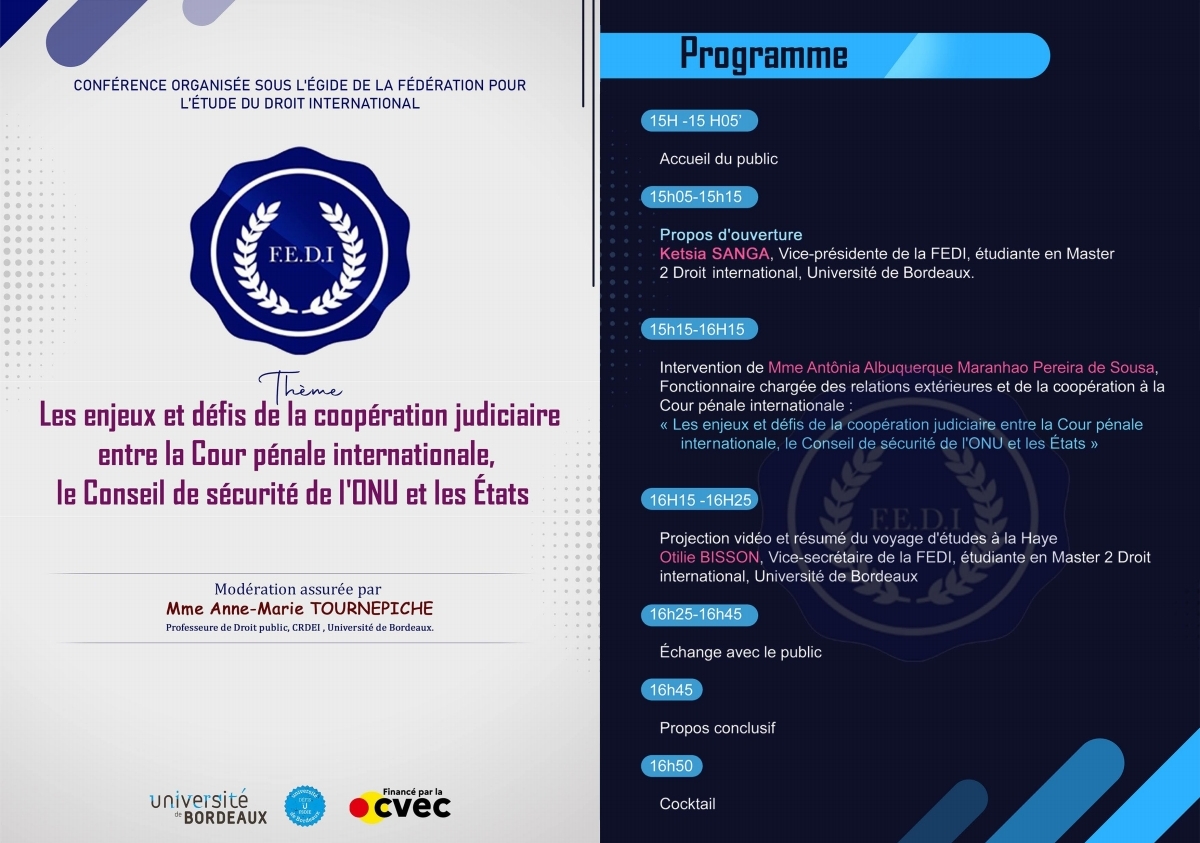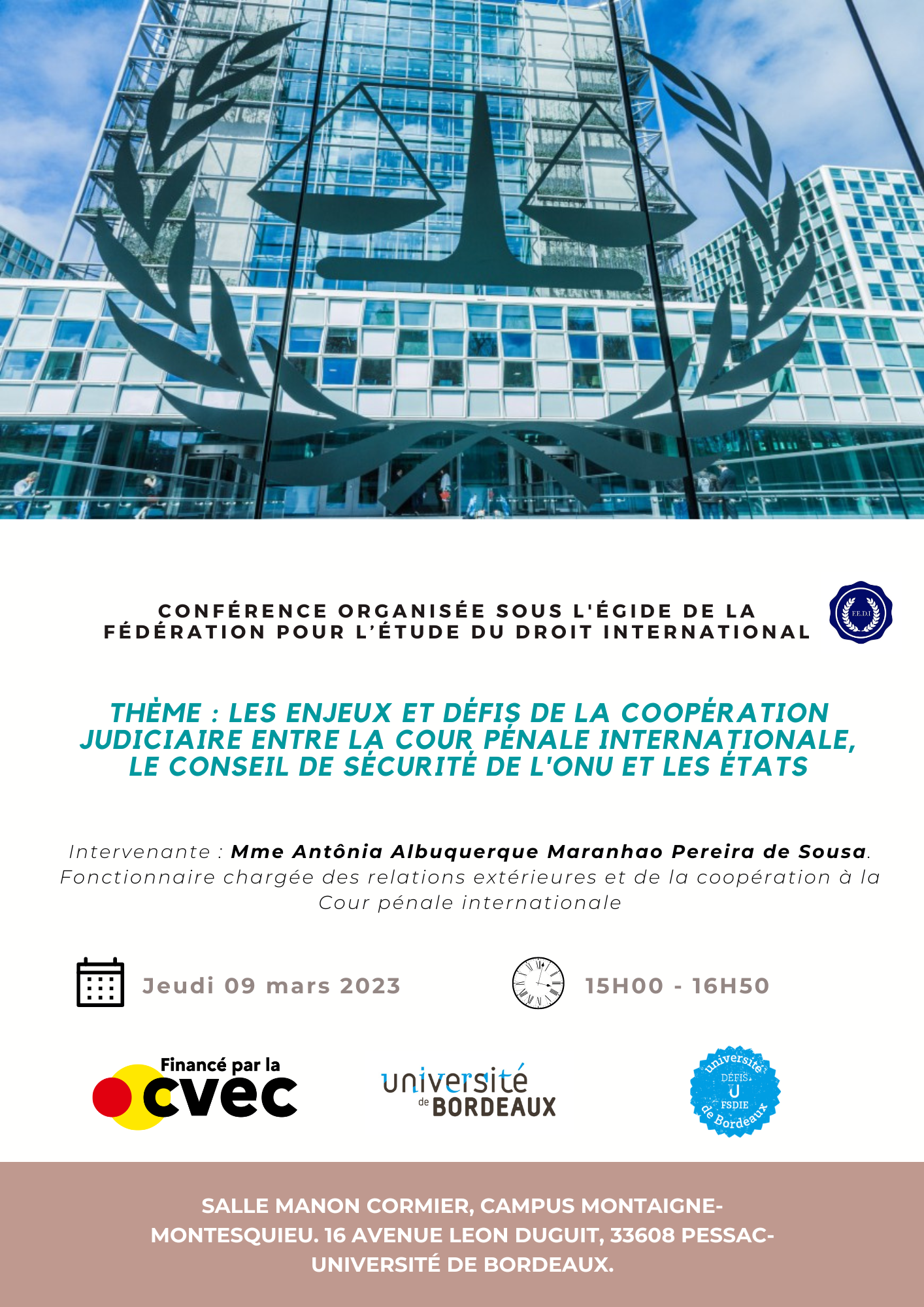 Feriez-vous partie de celles et ceux qui pensent que la Cour pénale internationale rendrait une justice sélective? Oui? Alors cette conférence est faites pour vous! En effet cette activité scientifique, organisée par la section Master 2 Droit international rattachée à l'association FEDI, vous permettra de conforter ou d'actualiser vos convictions sur la coopération judiciaire entre la Cour pénale internationale, le Conseil de sécurité de l'ONU et les États.