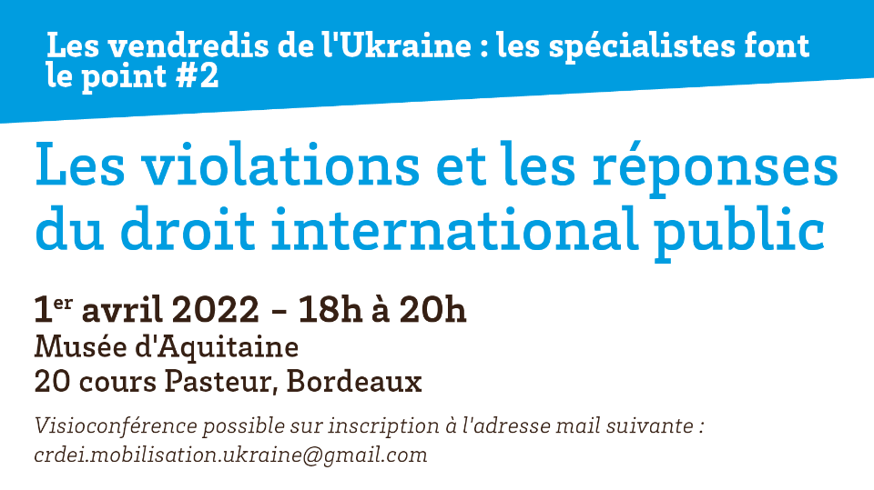 Cette conférence est en présentiel - au musée d'Aquitaine - avec la possibilité de la suivre en visioconférence sur inscription à l'adresse mail suivante : crdei.mobilisation.ukraine@gmail.com