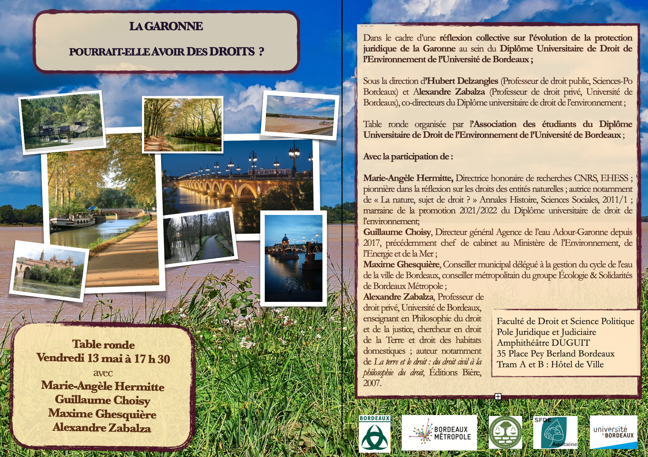 Ce vendredi 13 mai à 17 heures 30 sera le moment choisi par la Mairie de Bordeaux , Bordeaux Métropole , la Section Aquitaine de la Société du droit de l'Environnement , les étudiants du DU de droit de l'Environnement de l' Université de Bordeaux pour vous inviter et lancer un grand débat citoyen autour de nos usages et du statut juridique de la Garonne.